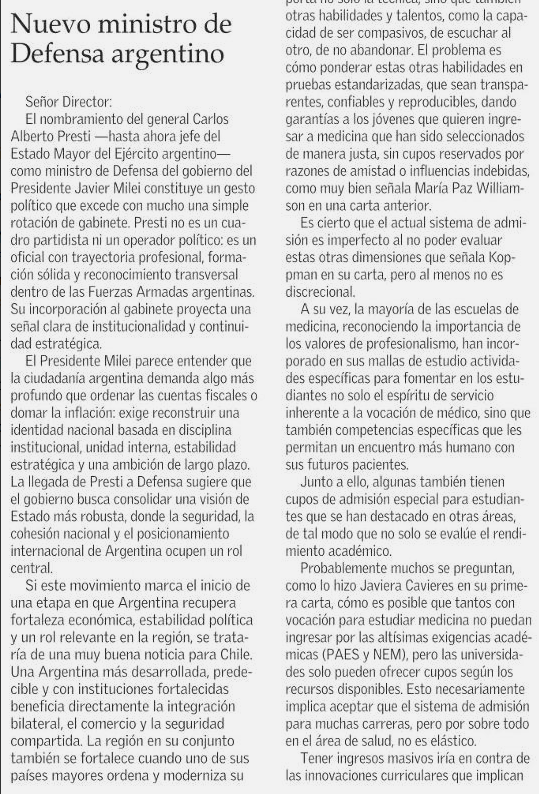 admin OPINIÓN diciembre 1, 2025 01 Dic 2025 Nuevo ministro de Defensa argentino Señor Director: El nombramiento del general Carlos Alberto Presti —hasta ahora jefe del Estado Mayor del Ejército argentino— como minis... Leer más